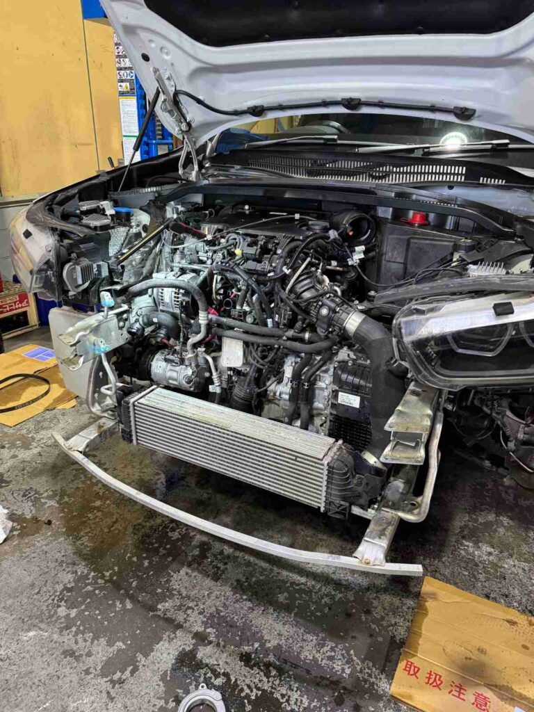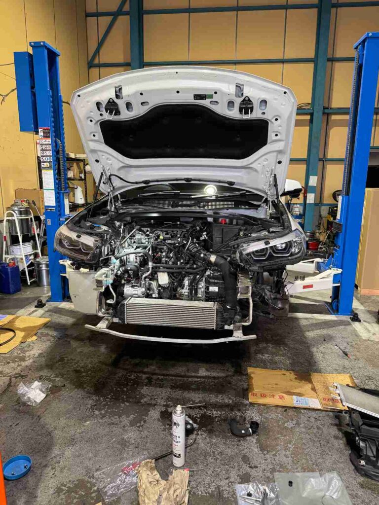 X2をご購入いただきありがとうございます。納車前の整備の様子です。当社ではBMWを末永く乗っていただけますように、納車前はきっちりと整備させていただきます。他店様より値段がお高くなるのも、その車の故障事例を参考に、予防整備までさせていただくパッケージもあります。今回のX2は予防整備のパッケージでのご購入ですので、弱点箇所もきっちり整備させていただきご納車させていただきます。