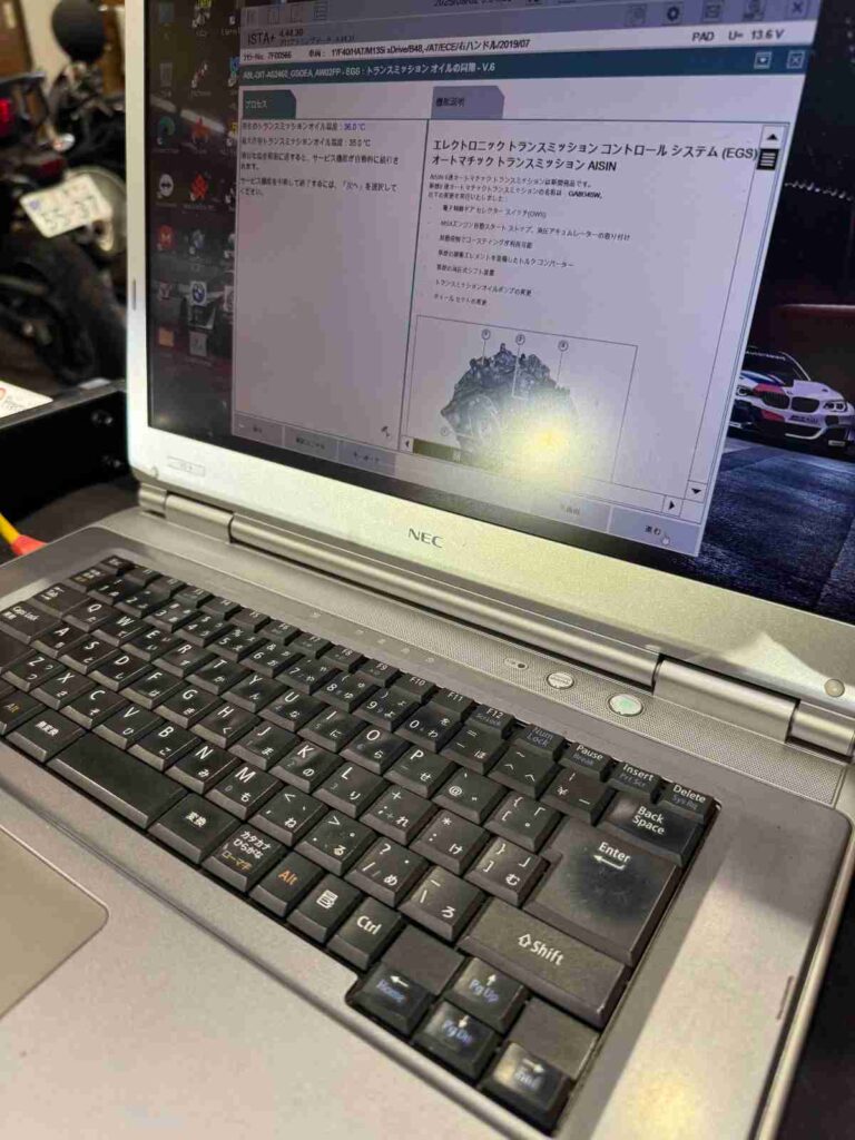 BMW ATF圧送交換 2025-09-27 今回はBMW F40のATFの圧送交換の作業です。圧送することで、ATのなかのオイルを潤滑しながら交換できます。ATの中のオイルがすべて新しいオイルになるということです。